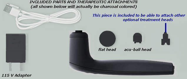 INCLUDED THERAPEUTIC ATTACHMENTS: 1) Flat Disc Head 2) Acu-point Ball Head for focused therapy 3) Accessory attachment for other available therapeutic heads